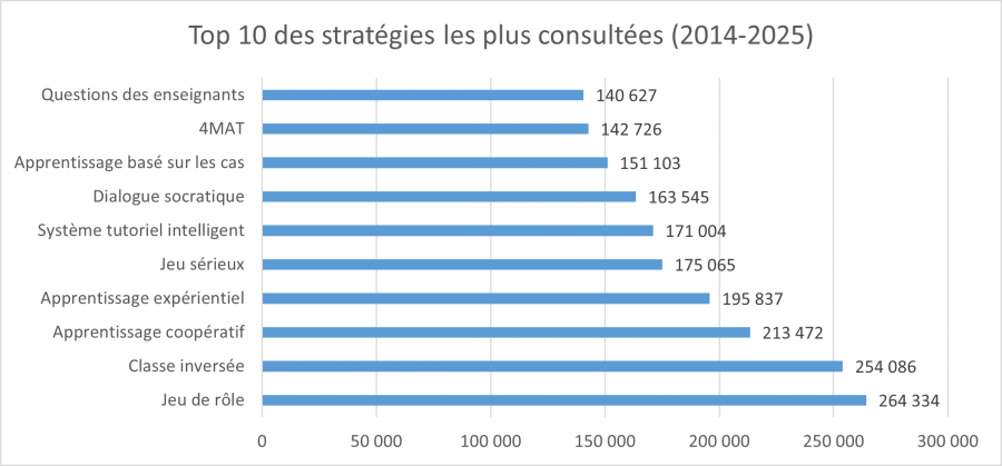 La question que l'on peut se poser est la suivante : le nombre de consultations reflète-t-il l'intérêt des internautes ? Si c'était le cas, pourrions-nous observer une évolution de l'intérêt dans le temps, et analyser par exemple comment la popularité des stratégies évolue avec les tendances, les technologies et les modes en éducation ? C'est une question à creuser !